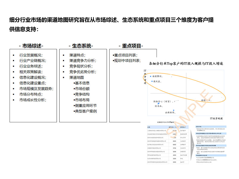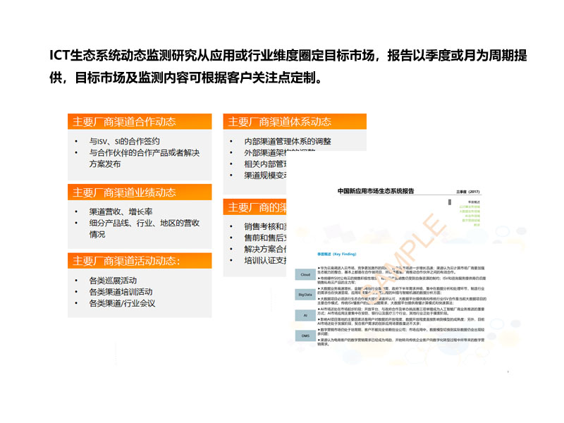 G-ECO持续关注着生态玩家群体的业务生命周期、新应用业务现状、基本ICT业态、重点ICT产品、重点合作品牌、业绩周期变化、业务结构变化、业务驱动力变化、生态系统评价、生态合作诉求等信息,并藉此建立对ICT市场的整体认知。据此,我们为客户提供如下服务: